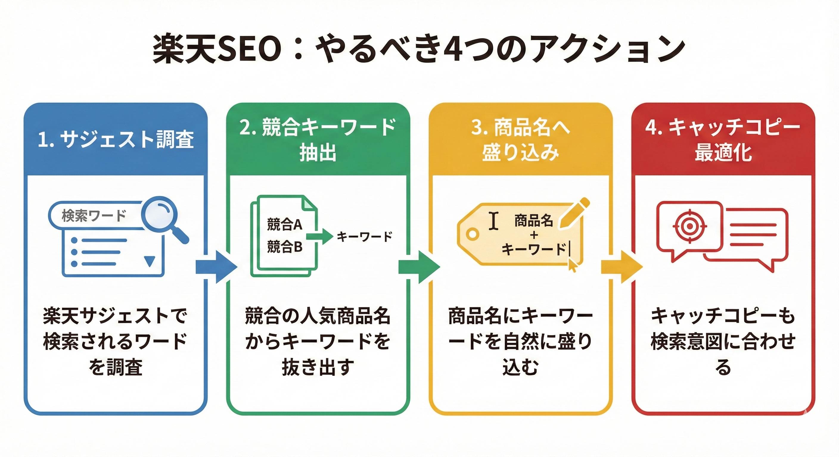 | ① 現状把握 | 売上 = アクセス × 転換率 × 客単価 | まずはRMSで自店の数値を出し、競合や目標値と比較して**「一番弱い数字(ボトルネック)」**を特定する。 |
