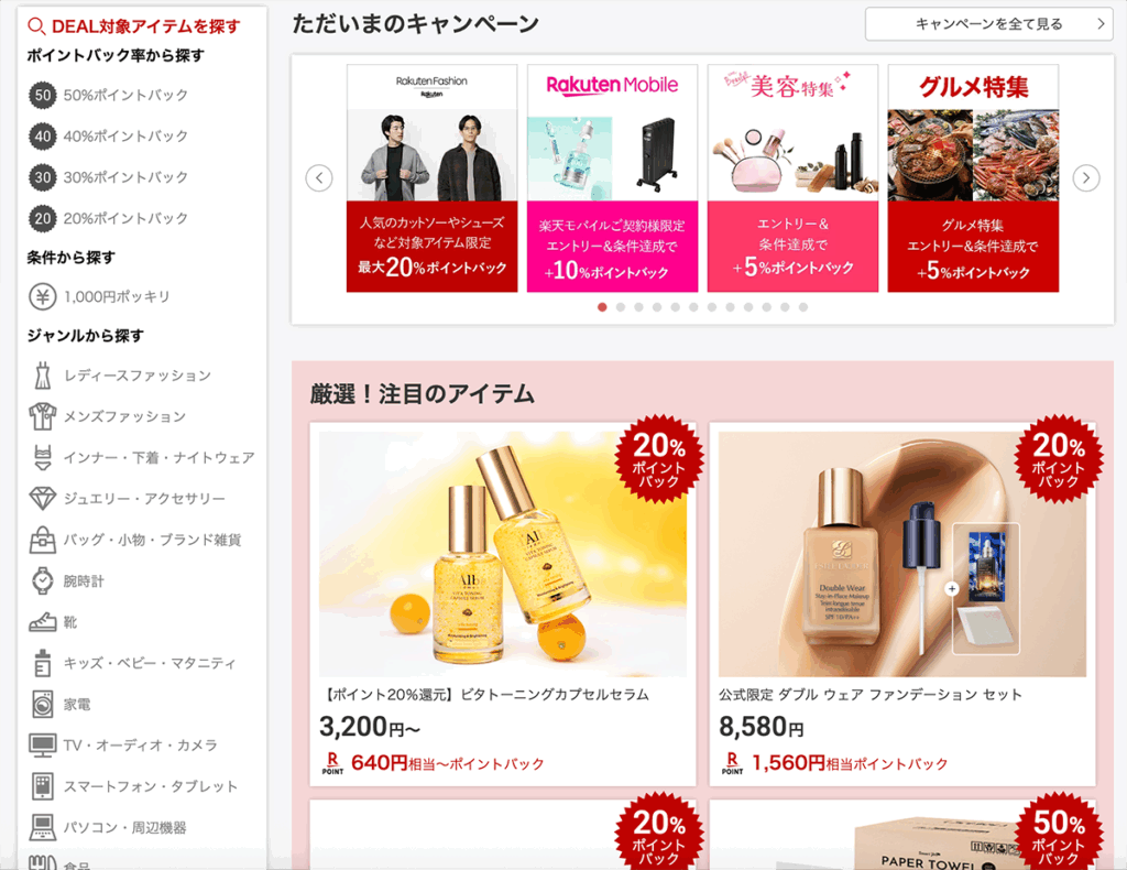 - 楽天スーパーDEALの企画ページへの掲載や、対象商品のみが表示される検索窓、対象商品を絞る機能など、導線が多く用意されている