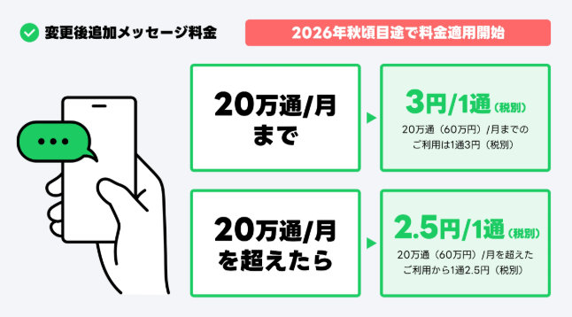 2026年秋ごろから新料金プランとして、20万通/月までのご利用は1通3円、20万通を超えたご利用分からの追加メッセージは1通2.5円になることが発表されています。