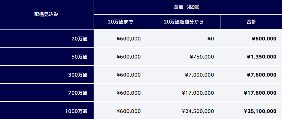 追加メッセージ配信数 単価 配信単価(目安) ~50,000 3.0円 3.00円 50,001~100,000 2.8円 3.00~2.90円 100,001~200,000 2.6円 2.90~2.75円 200,001~300,000 2.4円 2.75~2.63円 300,001~400,000 2.2円 2.63~2.53円 400,001~500,000 2.0円 2.53~2.42円 500,001~600,000 1.9円 2.42~2.33円 600,001~700,000 1.8円 2.33~2.26円 700,001~800,000 1.7円 2.26~2.19円 800,001~900,000 1.6円 2.19~2.12円 900,001~1,000,000 1.5円 2.12~2.06円 1,000,001~3,000,000 1.4円 2.05~1.62円 3,000,001~5,000,000 1.3円 1.62~1.49円 2026年秋ごろから新料金プランへの移行を予定