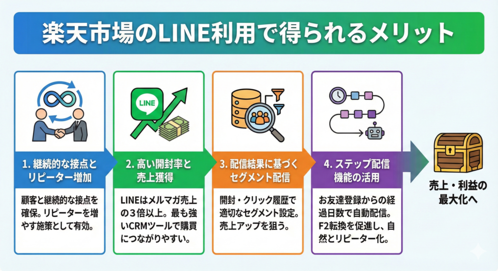 楽天市場のLINE利用で得られるメリットは、顧客と継続的な接点を確保し続けられる点です。リピーターを増やす施策として利用しましょう。