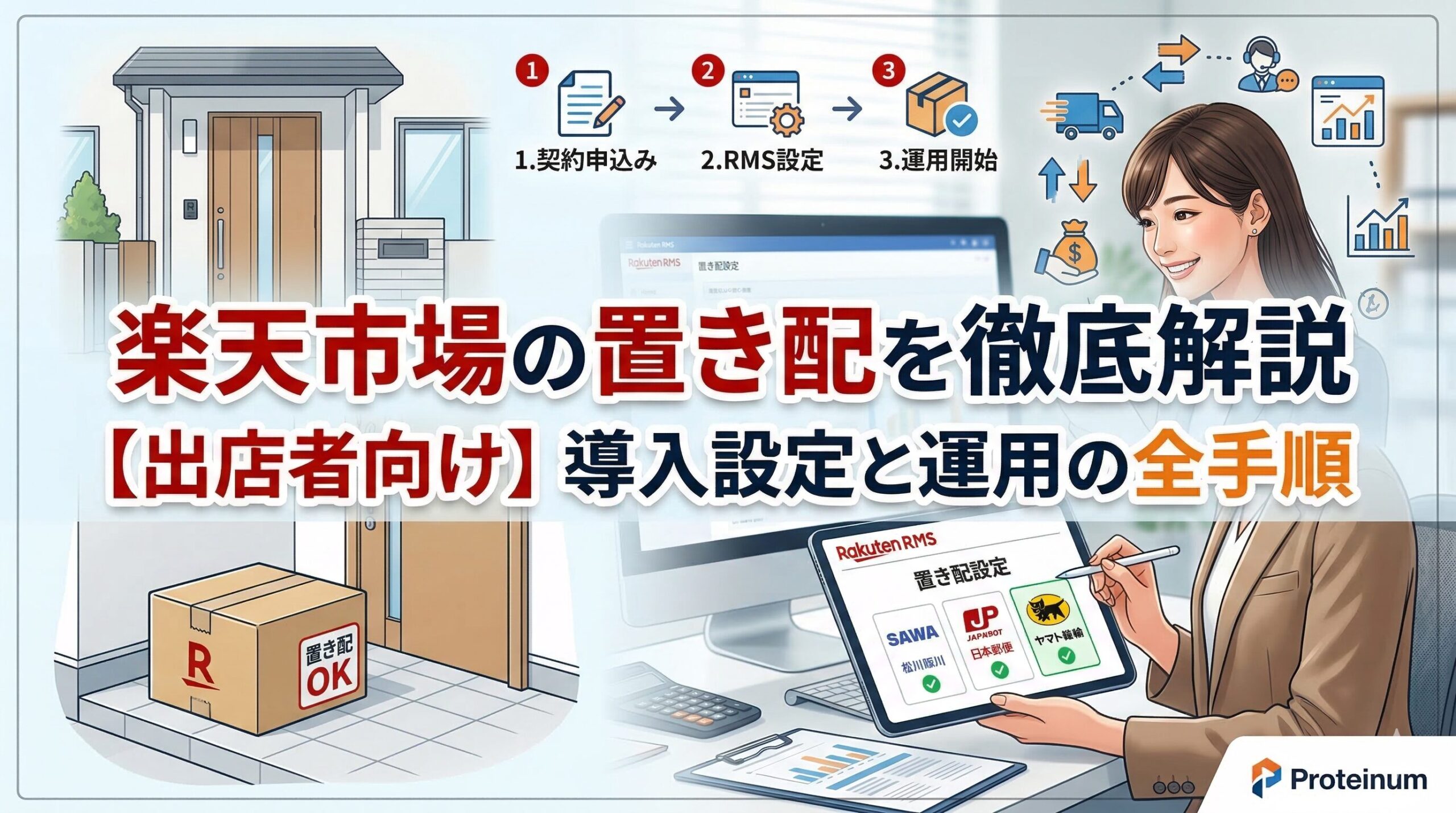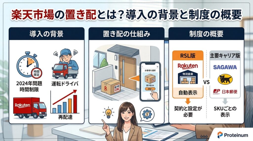 この記事は、これまでの支援実績が1,000社以上、広告運用実績年間10億円以上の弊社(Proteinum)が楽天市場の置き配に関する制度概要から具体的な導入手順、トラブル対策までを網羅的に解説します。