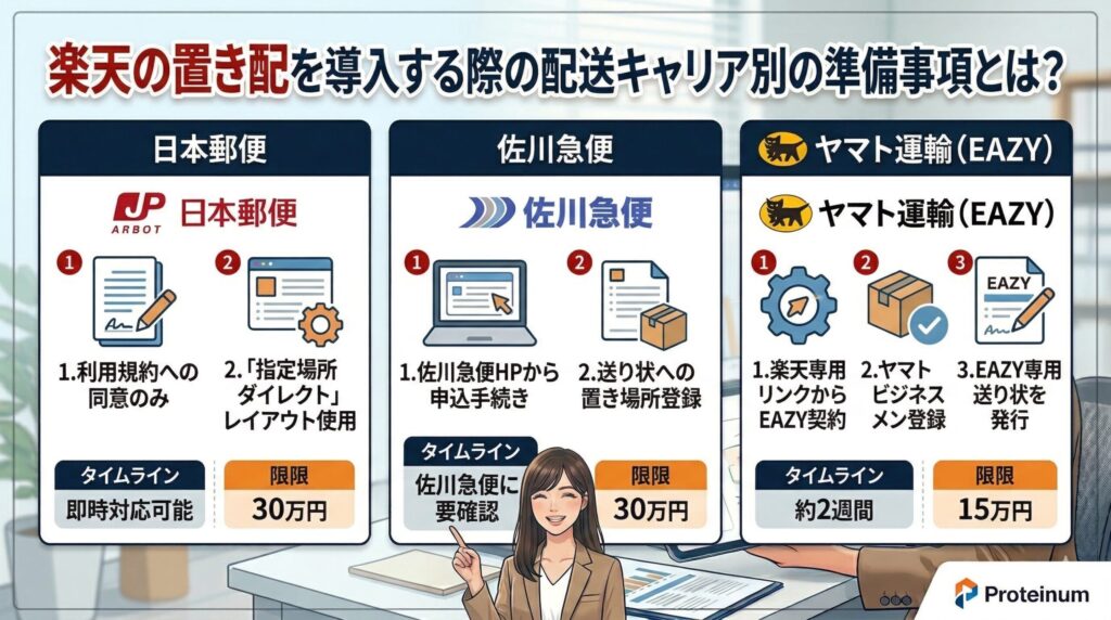 楽天市場の主要キャリア版置き配を導入するにあたり、出店者は利用する配送キャリアごとに異なる準備を進める必要があります。日本郵便・佐川急便・ヤマト運輸の3社それぞれで、契約形態や申込手順、対応完了までのリードタイムが異なるため、自店舗が利用するキャリアの要件を正確に把握しておくことが重要です。以下に、キャリア別の準備事項を整理します。