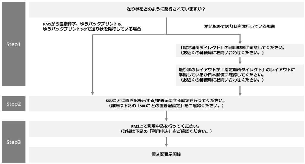 - RMSでの設定は3ステップで構成される。SKUごとの置き配表示設定、オプション機能の利用申込み、送り状発行様式の確認を漏れなく完了させる必要がある