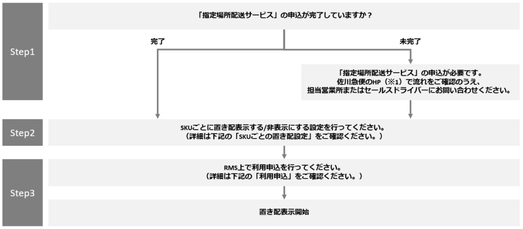 主要キャリア版は、佐川急便・日本郵便・ヤマト運輸のいずれかで配送される商品が対象です。出店者は各配送キャリアとの置き配に関する契約締結または利用規約への同意が必要であり、さらにSKU単位での置き配表示設定とRMS上での利用申込みを完了する必要があります。
