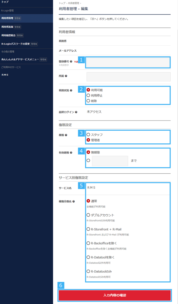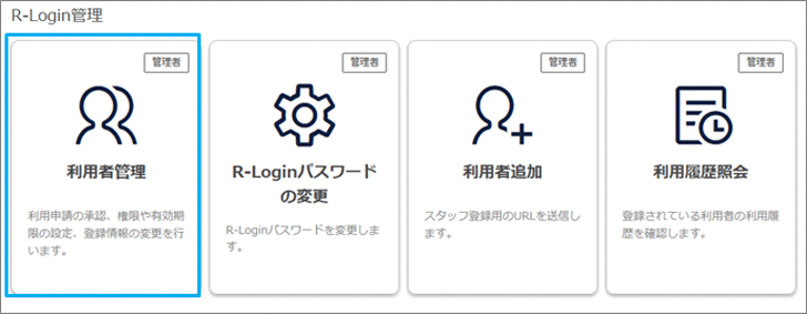 1.R-Login「利用者管理」へアクセス:管理者のIDでログインし、[利用者管理]を選択