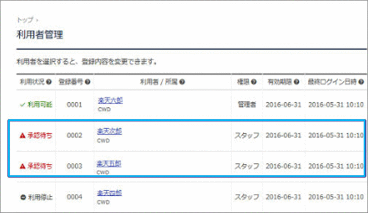 2.スタッフの承認:一覧から[承認待ち]となっているスタッフを選択し、利用を許可
