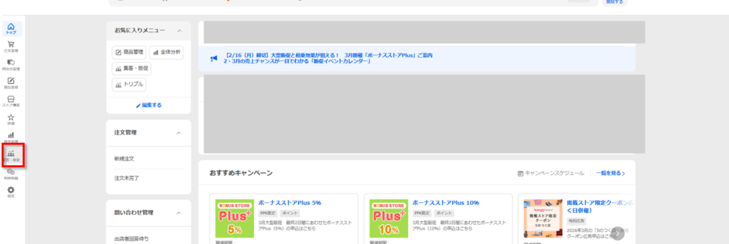 ストアクリエイターProにログイン後、レフトナビから集客・販促をクリックする。