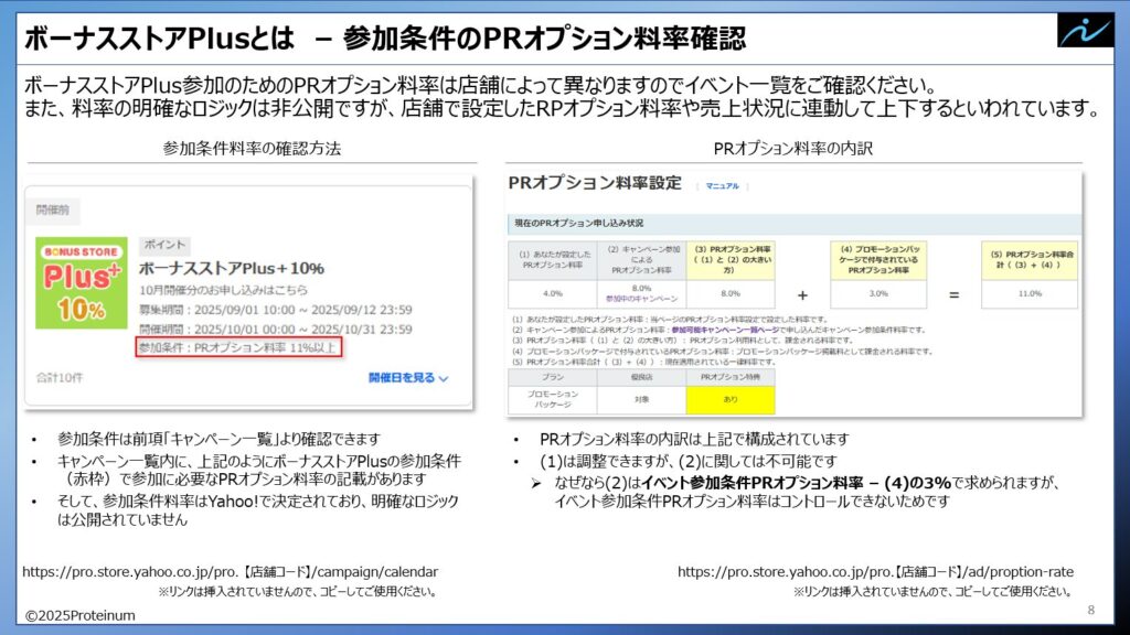 大前提として、ボーナスストアに参加するには「キャンペーン参加によるPRオプション料率」をコストとしてYahooに支払う必要があります。これは自店舗ではコントロールできず、また店舗によって料率が異なるため自店舗が何%かはストアクリエイターProのPRオプション料率設定から確認する必要があります。