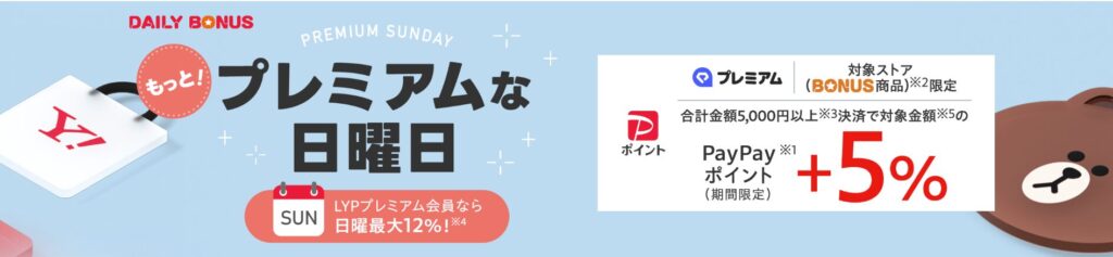 • 最大12%の高還元が実現する 「毎日5%」+「LYPプレミアム会員特典(+2%)」に、この「プレミアムな日曜日(+5%)」が上乗せされることで、ユーザーは最大12%という非常に高い還元率を享受できます。(※付与率や条件は開催日によって変動する場合があります)