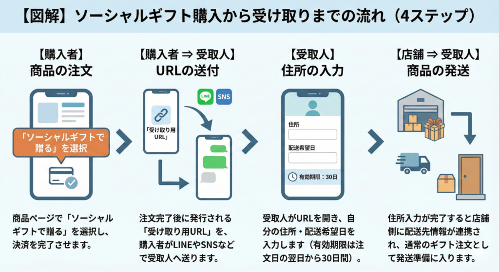 ソーシャルギフト購入から受け取りまでの流れ(4ステップ)