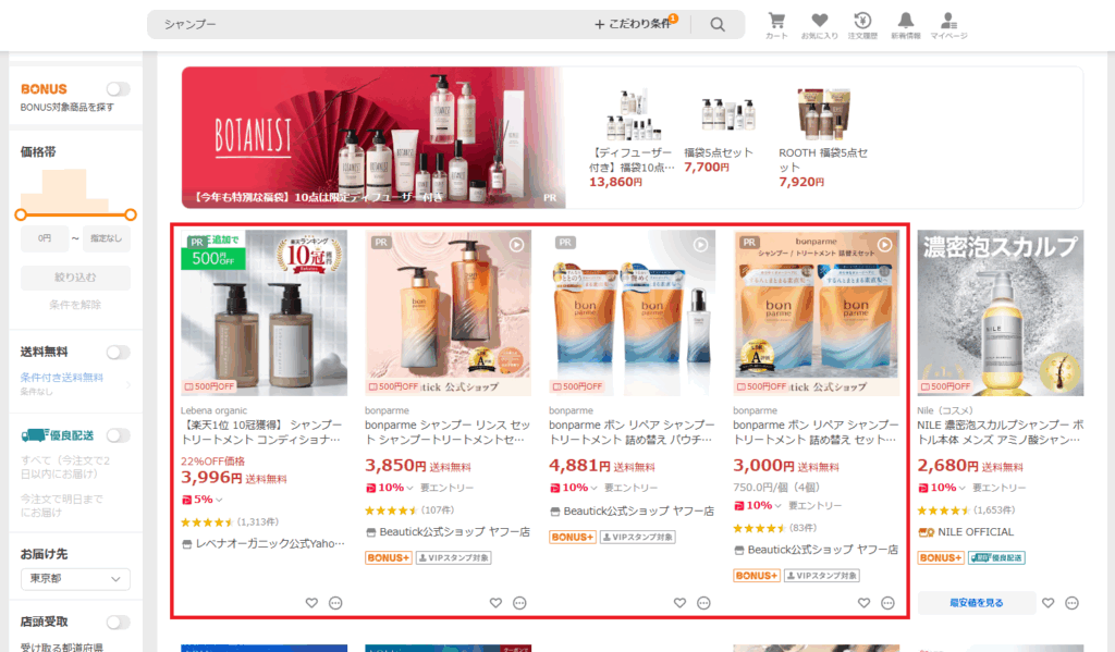 アイテムリーチ広告の掲載箇所は、検索ページやカテゴリ一覧ページです。