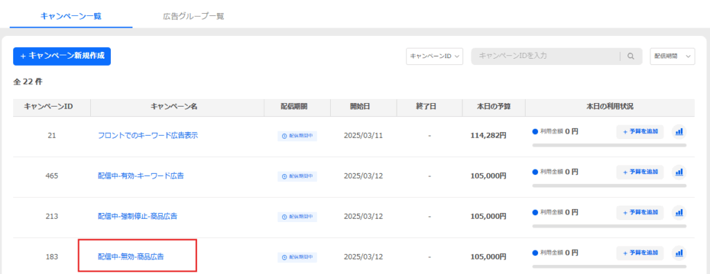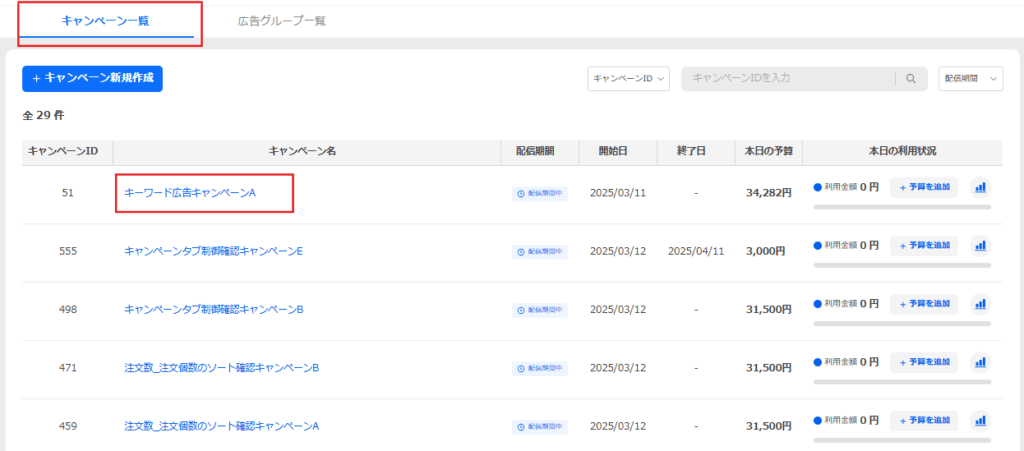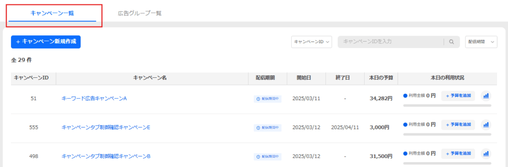 [キャンペーン]タブの[キャンペーン一覧]を選択します。