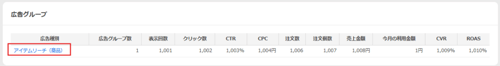 対象のキャンペーン詳細で、広告グループから[アイテムリーチ(商品)]をクリックします。