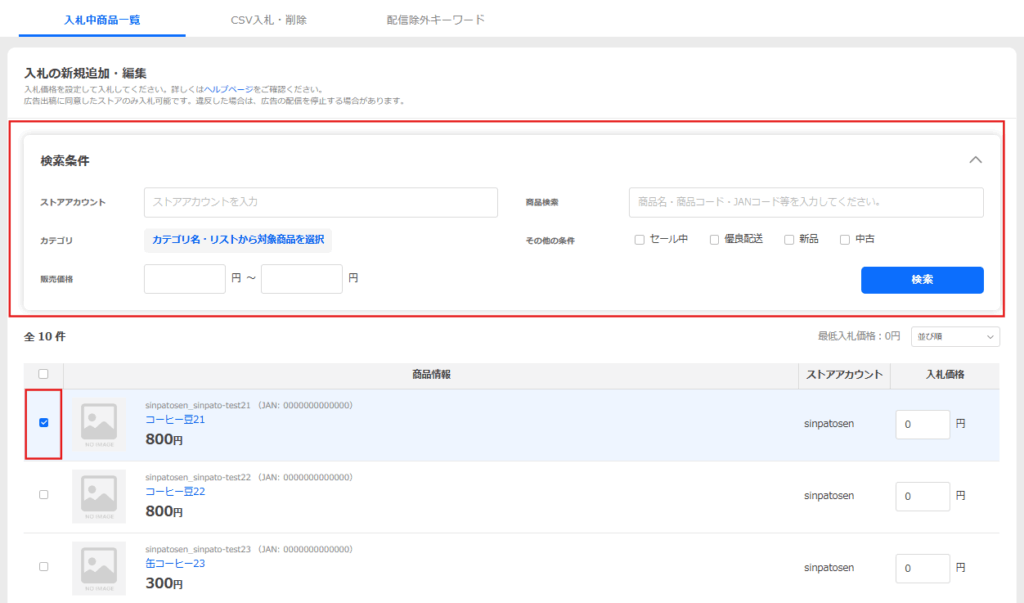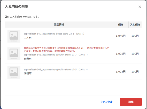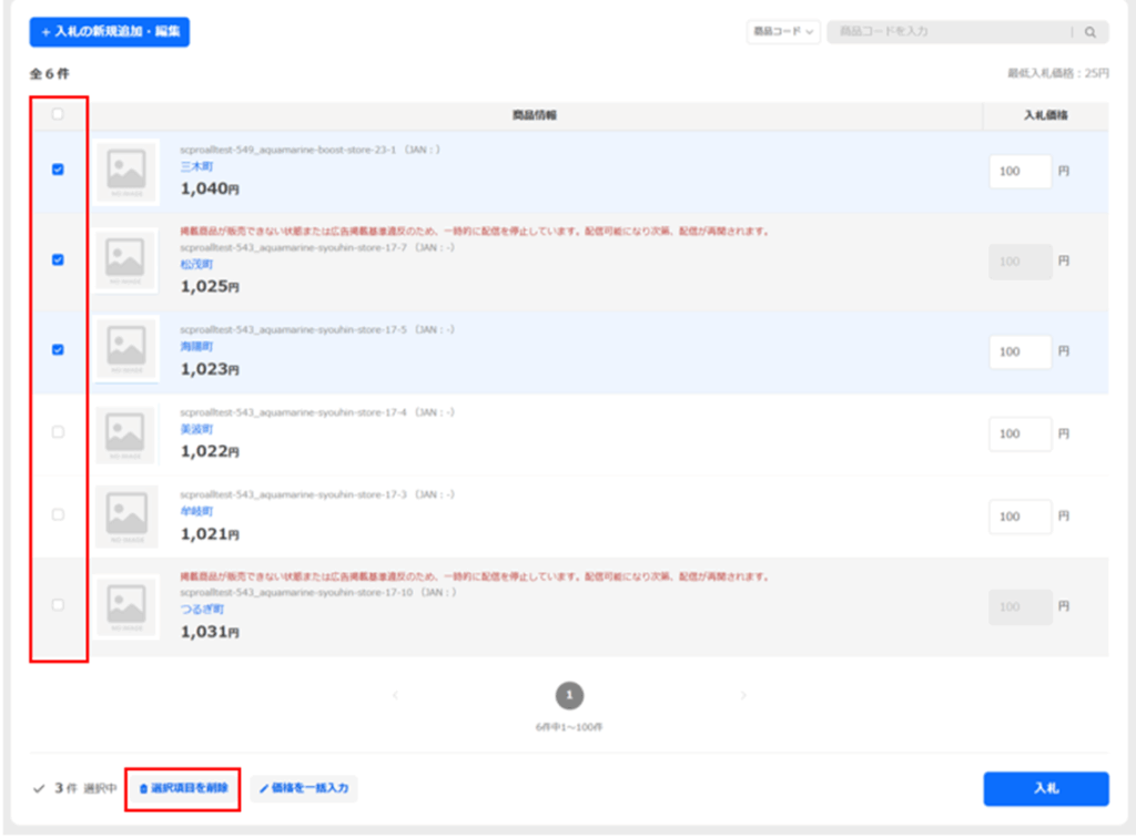 表示されている商品リストから、入札削除をしたい商品をチェックし、[選択項目を削除]ボタンをクリックします。