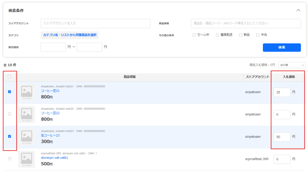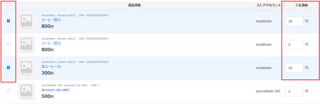 表示されている商品リストから、入札したい商品をチェックします。