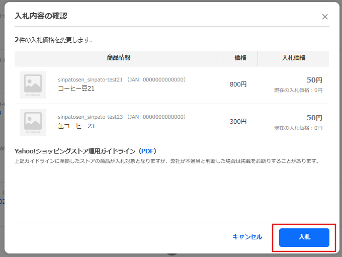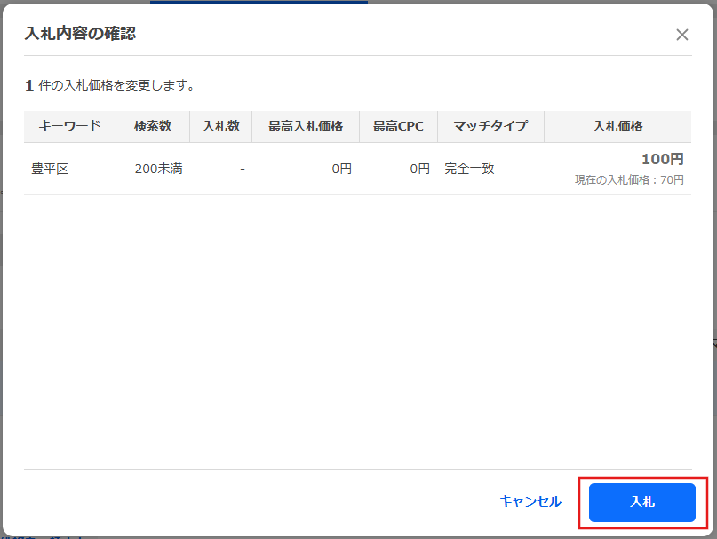 確認画面が表示されたら、[入札]ボタンをクリックします。