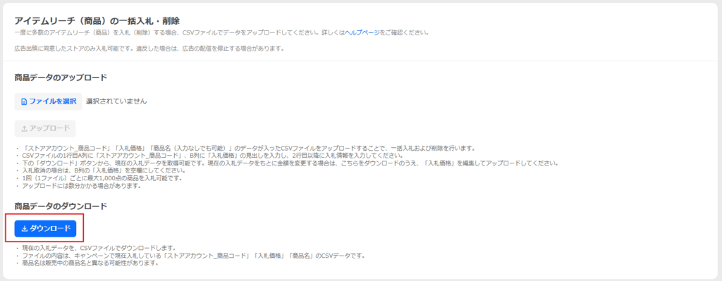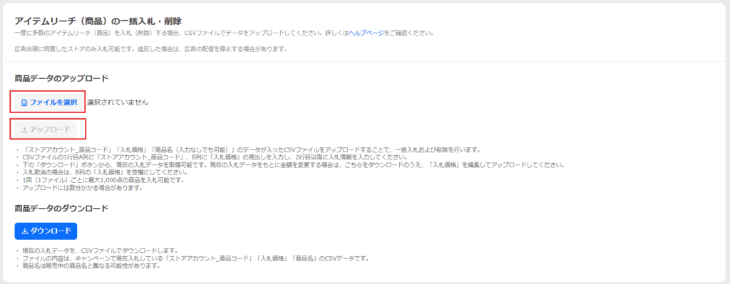 CSVにご希望の商品コード、入札価格をご入力ください。一括削除の場合は、入札価格を空欄にしてご入力ください。
