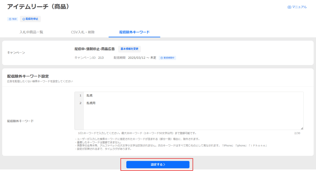 入力欄に除外したいキーワードを入力し、[設定]をクリックします。編集・削除も同様の手順で実施できます。