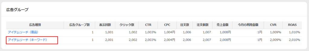 • 広告詳細レポート:広告グループごとに実績を確認できます。