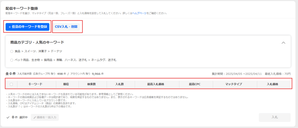キーワード登録時の登録方法に関わらず、登録済みのキーワードが人気のキーワードに含まれる場合、検索数や入札情報が表示されます。