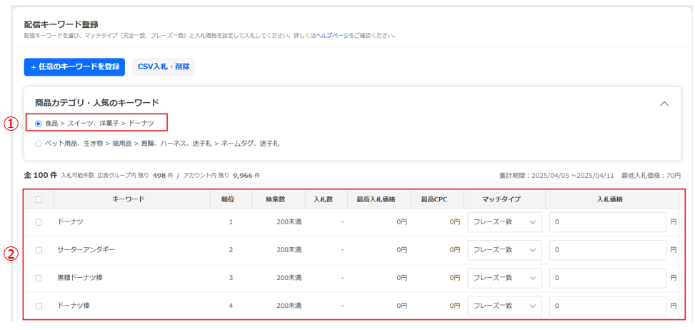 『配信対象の商品登録』で登録した商品の属するカテゴリーにあわせ、商品カテゴリーが表示されます(➀)。複数表示されている場合は1つ選択してください。選択した商品カテゴリーの人気のキーワードが一覧で表示されます(➁)。