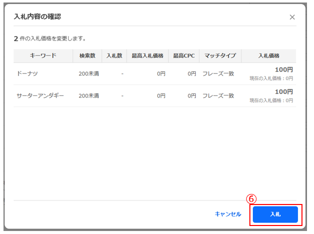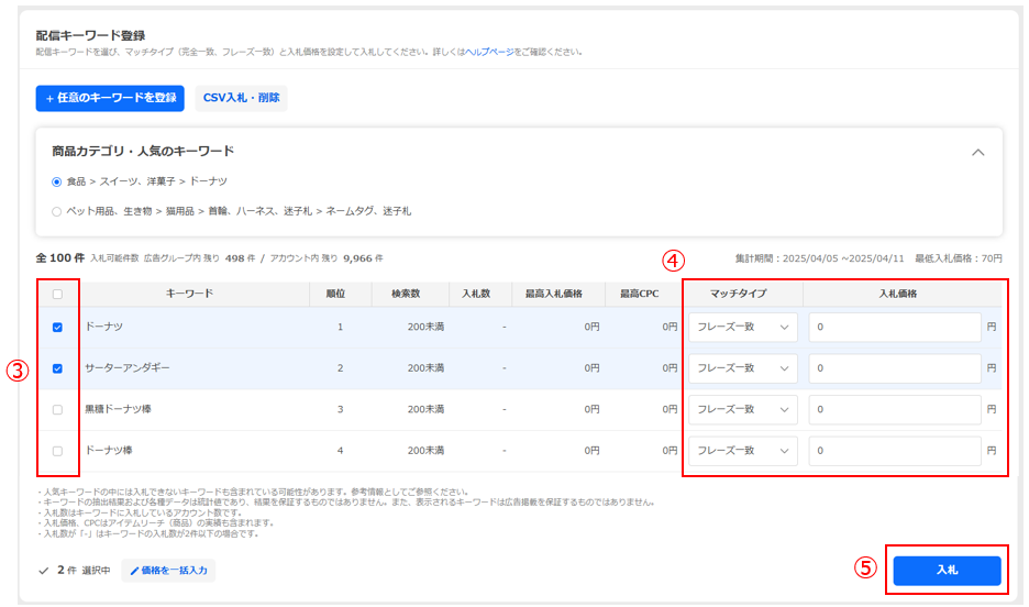 配信したいキーワードを選択し(③)、配信キーワード毎にマッチタイプを選択、入札価格を入力します(④)。[入札]ボタンをクリックします(⑤)。