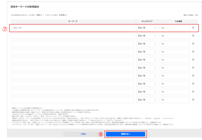 キーワードに配信キーワード(検索される際の文字列)を入力、マッチタイプを選択、入札価格を入力します(⑦)。入力が完了したら[登録する]ボタンをクリックします(⑧)。