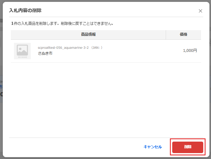 対象商品情報と入札価格の確認画面が表示されます、[削除]ボタンをクリックして入札完了です。