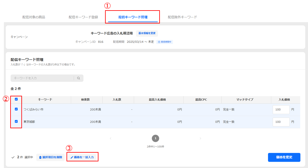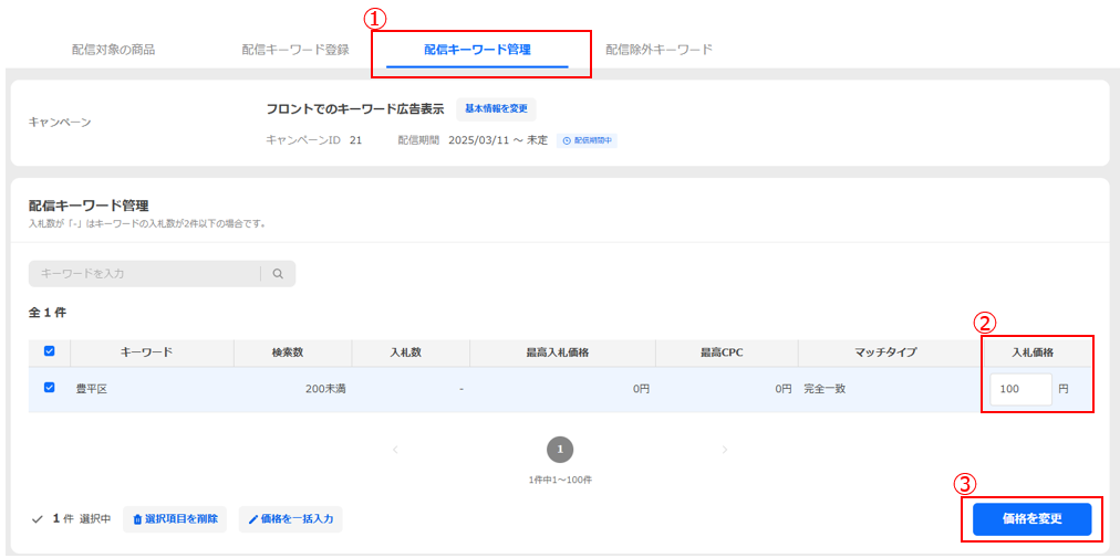 キーワード広告の詳細設定用画面の[配信キーワード管理]タブで(①)、入札済みキーワードの左のチェックボックスから入札価格を変更したいキーワードをすべて選択し(②)、[価格を一括入力]ボタンをクリックします(③)。