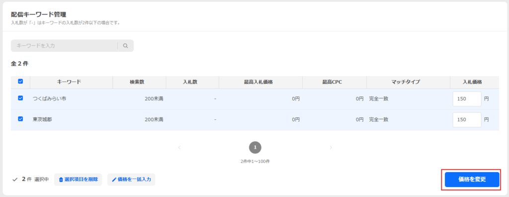 配信キーワード管理画面に戻り、入札価格が一括価格入力で入力した入札価格に変更されている旨を確認し「価格を変更」ボタンをクリックします。