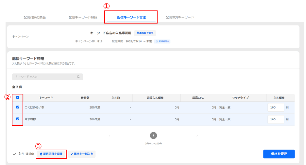 キーワード広告の詳細画面の[配信対象の商品]タブで(①)、左のチェックボックスから削除したいものをすべて選択し(②)、[削除]ボタンをクリックします(③)。