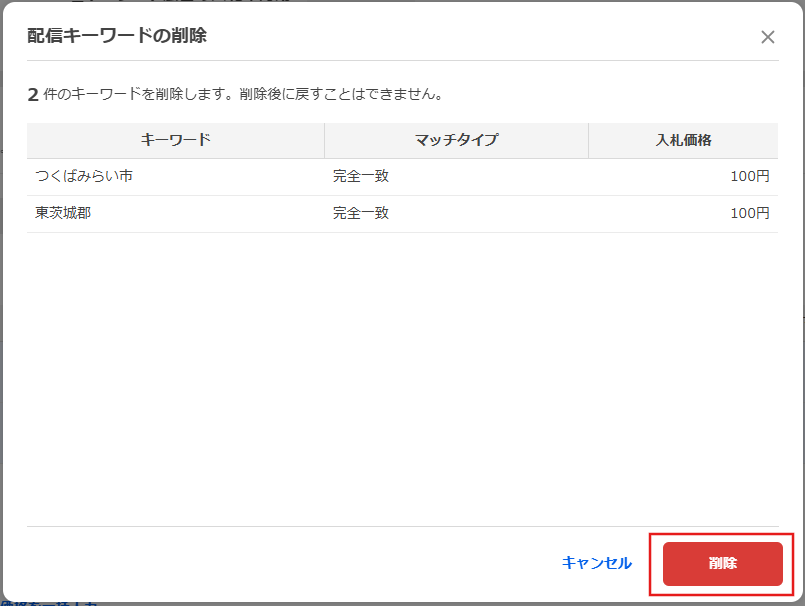 入札を削除したい、つまり広告配信を停止したいときは下記方法から対応できます。