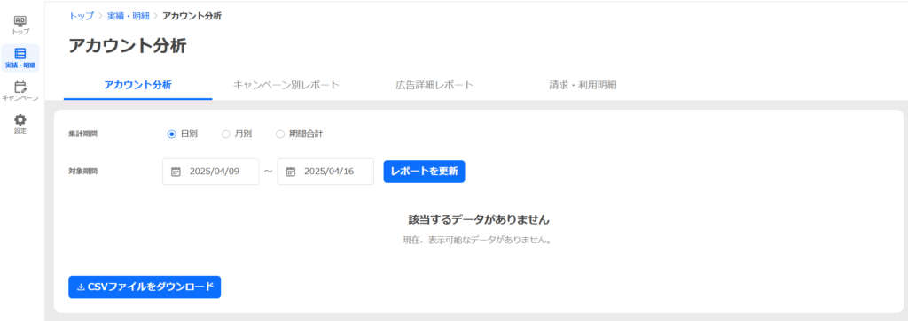集計単位は、日別と月別と期間合計の3種類があり、管理画面の[実績・明細]タブのメニュー[アカウント分析]より、レポートの閲覧とCSVファイルダウンロードを行うことができます。